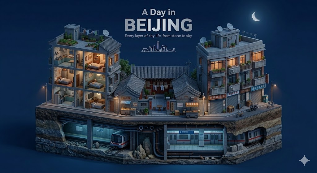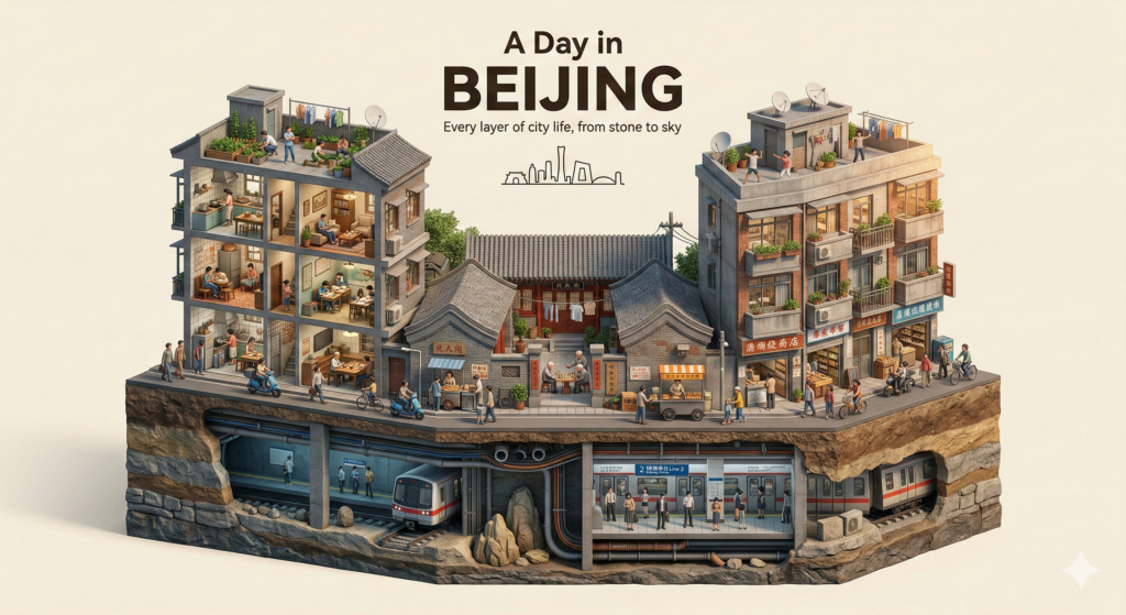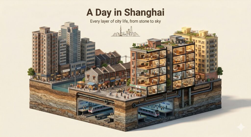 The entire composition reads as one unified vertical slice — from bedrock to skyline — capturing the essence of an ordinary day in [CITY NAME].